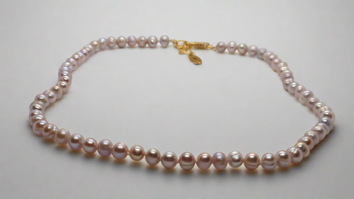 Delicate and distinctive, this lavender pearl necklace exudes a soft, celestial charm. It features luminous, lavender-toned potato-shaped pearls, each carefully selected and individually hand-knotted for lasting durability and graceful movement. Secured with a gold-finished lobster clasp, it blends refined style with dependable wear. A dreamy statement piece that brings a whisper of color and elegance to any ensemble.